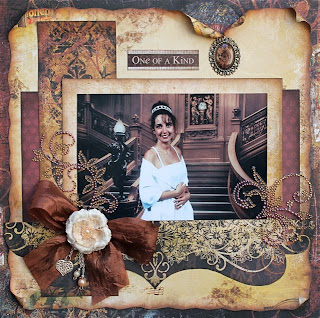 Make a big bow with wide copper ribbon and glue a cream flower (mine is Prima) in the middle with Helmar 450 Quick Dry glue. Glue your bow embellishment to the bottom left of the photo using the 450 glue too. Now, add some bling - I cut a Prima bling in half and added it to each bottom side of the photo. Lastly, add the title and you're done!