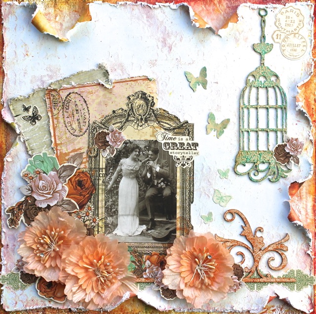 I added more chipboard, sticker elements and a flower. The chipboard birdcage was treated with gesso, Silks paint (from a previous kit) and brown chalk ink. TIP: I fussy cut some of the sticker flowers apart.