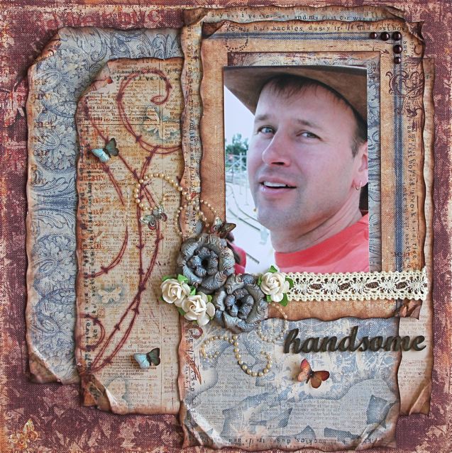 In my second layout of my hubby and I almost 10 years ago (wow times flies!), I paired my 2 favorite papers from the Pion collection with the gorgeous Prima bling and flowers in the kit. I added the doily and Dusty Attic chipboard from my stash but the embellies are all from the main kit. See how I used the flower paper in 2 layouts? You will want to get double papers this month (and they will sell out FAST!)