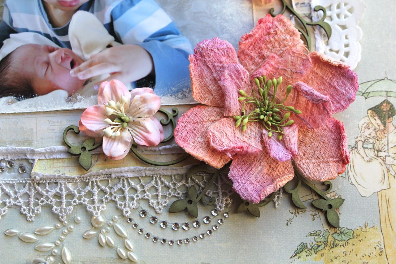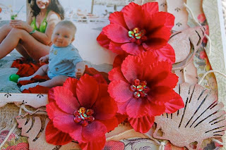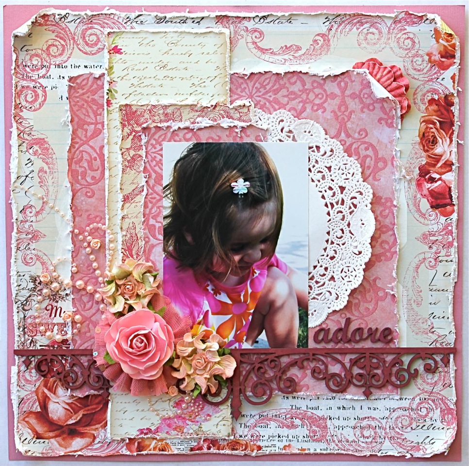 My second layout "caress" was taken on the day we brought my daughter home. Such a tender sibling moment. Again, I just LOVE these Prima papers and the gorgeous flowers in this kit. The background cardstock was from my stash and the doilies were featured in last month's kit. Isn't the Prima lace/bling divine?
