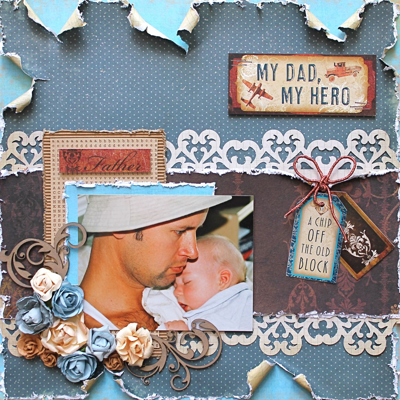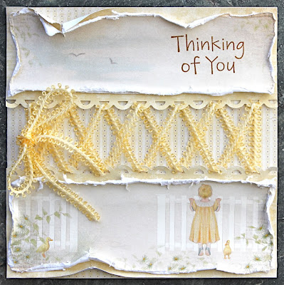For my third project, I made a new display for my mantle (I do this every season). I layered 2 of the Pion papers. The chipboard, doily and ribbon are from my stash. The Kaiser sentiment paper is so beautiful in this kit and the little Petaloo butterflies are such a cute touch!