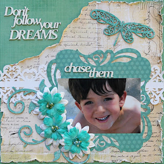 I added some gorgeous 2Crafty chipboard (title and santa sleigh) and limited the flowers since it is a boy layout. Here is a close-up of the music notes on the paper behind the chipboard. On the chippies I dabbed texture paste to give it a snowy effect and then added some diamond dust (glitter glass would work wonders too). I actually clipped the third snowflake off the title and added to the top of the tree. For this one I simply used gold glitter glue on top of the clear diamond dust to give it extra sparkle.